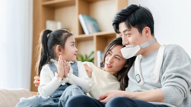 The system consists of a noise-canceling mask and a neckband-mounted main unit, designed for home use scenarios. The noise-canceling mask incorporates a proprietary noise-canceling chamber, delivering effective noise reduction while ensuring comfortable wear and unobstructed airflow, all while maintaining clear audio capture. The neckband unit features an ergonomic curved design for lightweight comfort without neck strain. The system requires no operation by the child—parents wear it instead—and functions activate hands-free without buttons, freeing hands and allowing uninterrupted daily activities.